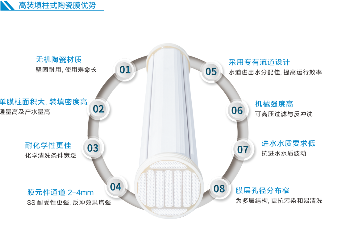 樱桃视频大全免费高装填柱式樱桃视频大全是在樱桃视频大全免费传统管式樱桃视频大全及平板式樱桃视频大全技术基础上研制出的一款用于水处理的无机超滤膜。高装填柱式樱桃视频大全是采用高强度α-Al2O3在高温下焙烧制成,拥有良好的耐高温性能,抗化学腐蚀性,优秀的机械强度。相对传统多通道管式樱桃视频大全,高装填柱式樱桃视频大全单支膜管过滤面积可达 10-25 ㎡,拥有更大的装填密度及处理能力,能够有效去除固体悬浮物、细菌以及胶体等物质,可应用于民用安全用水、市政给水和废水处理、应急供水、水回用、工业过程废水等多个领域。